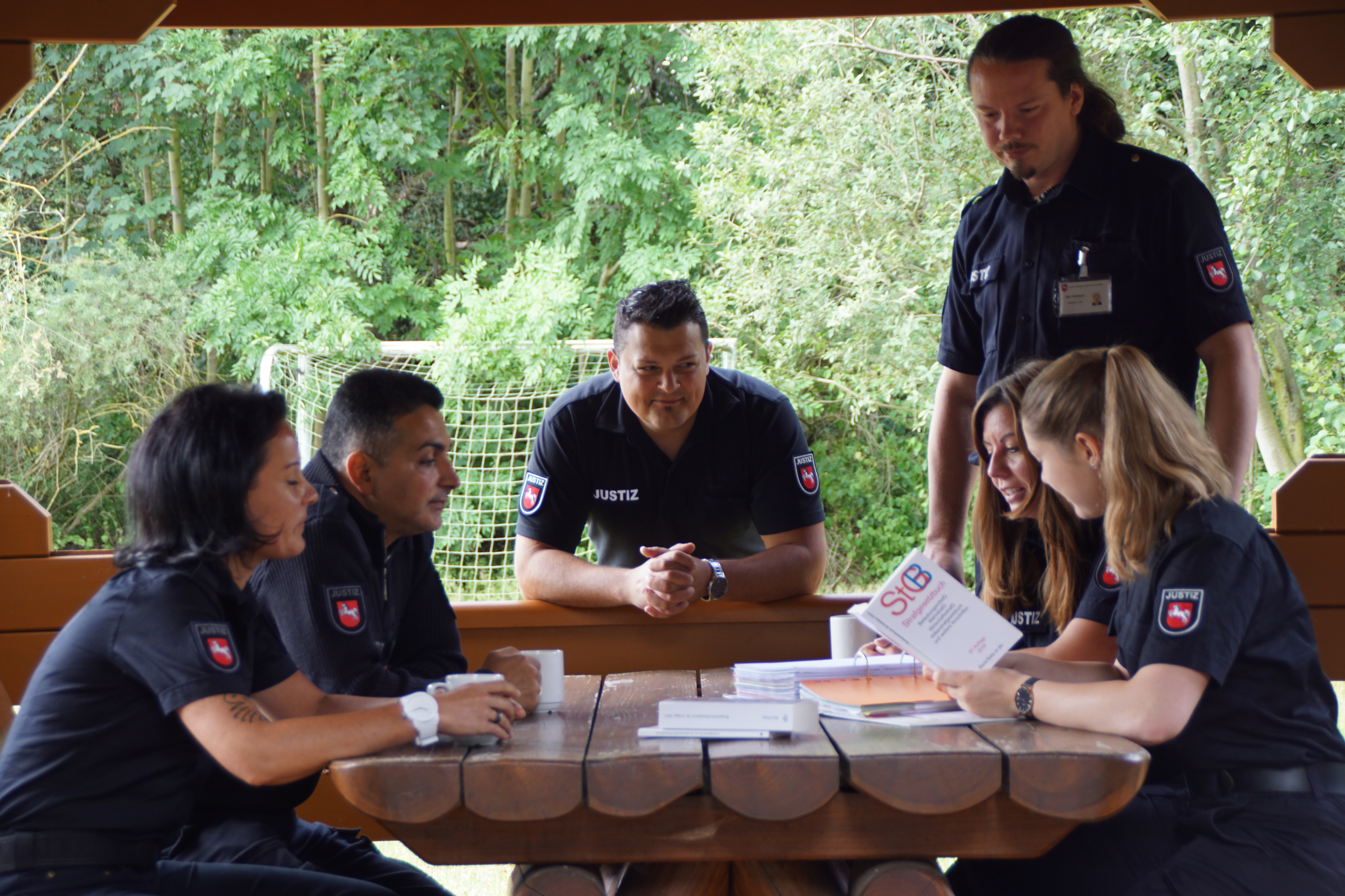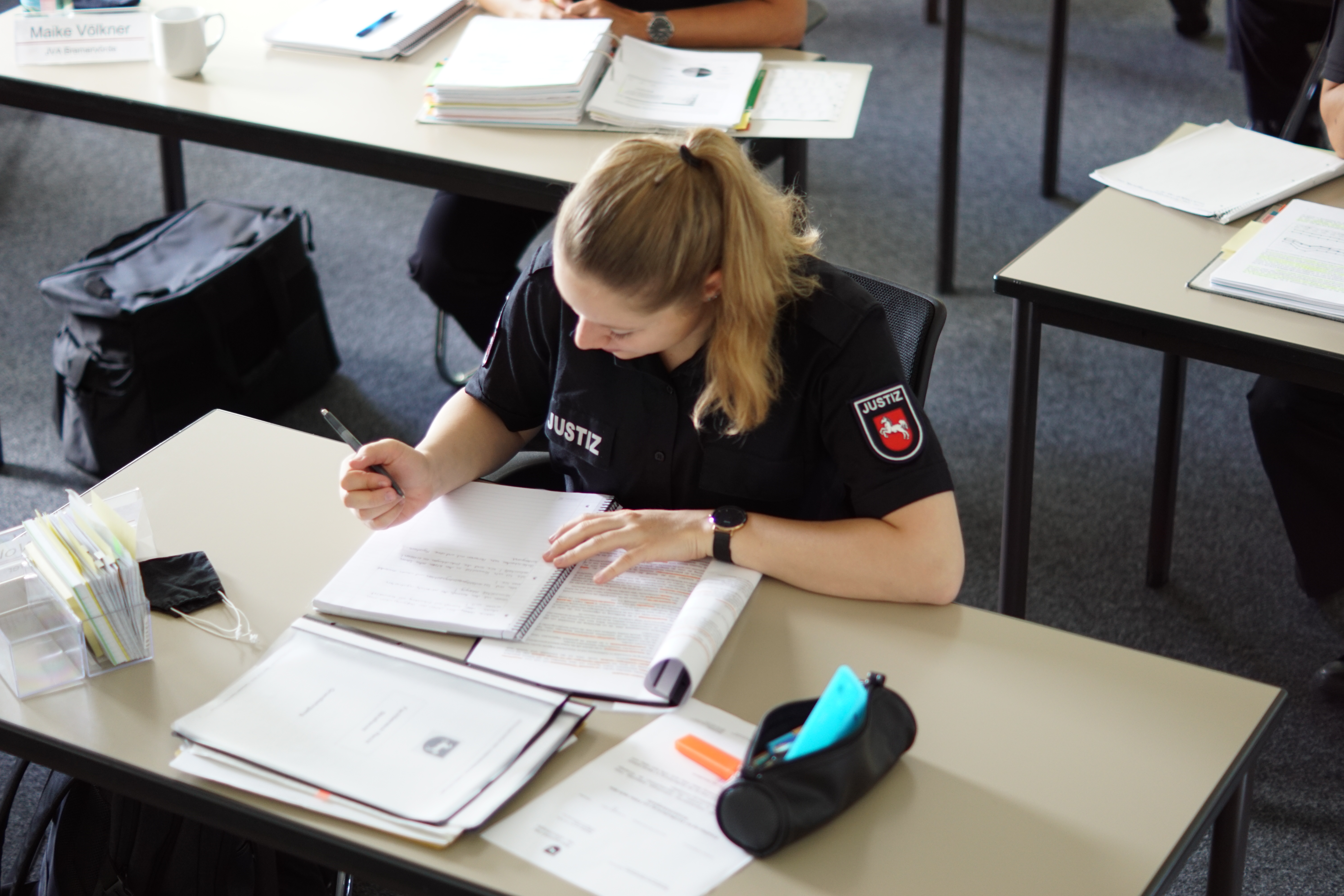 Die Fortbildung für alle Justizvollzugsbediensteten des Landes wird zentral von uns konzipiert, organisiert und verwaltungsmäßig umgesetzt. Wir steuern auch das fachpraktische Studium des gehobenen Vollzugs- und Verwaltungsdienstes.